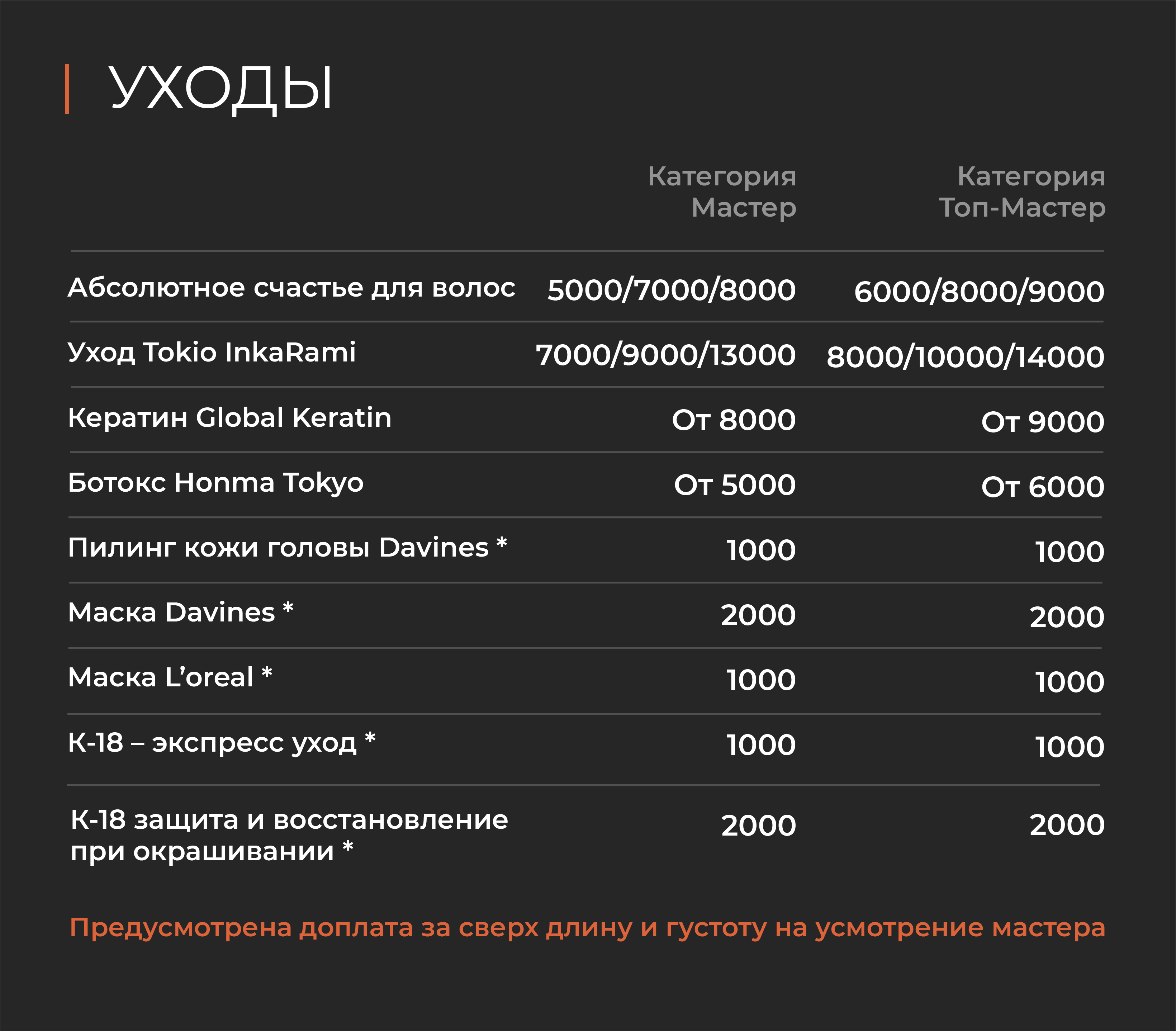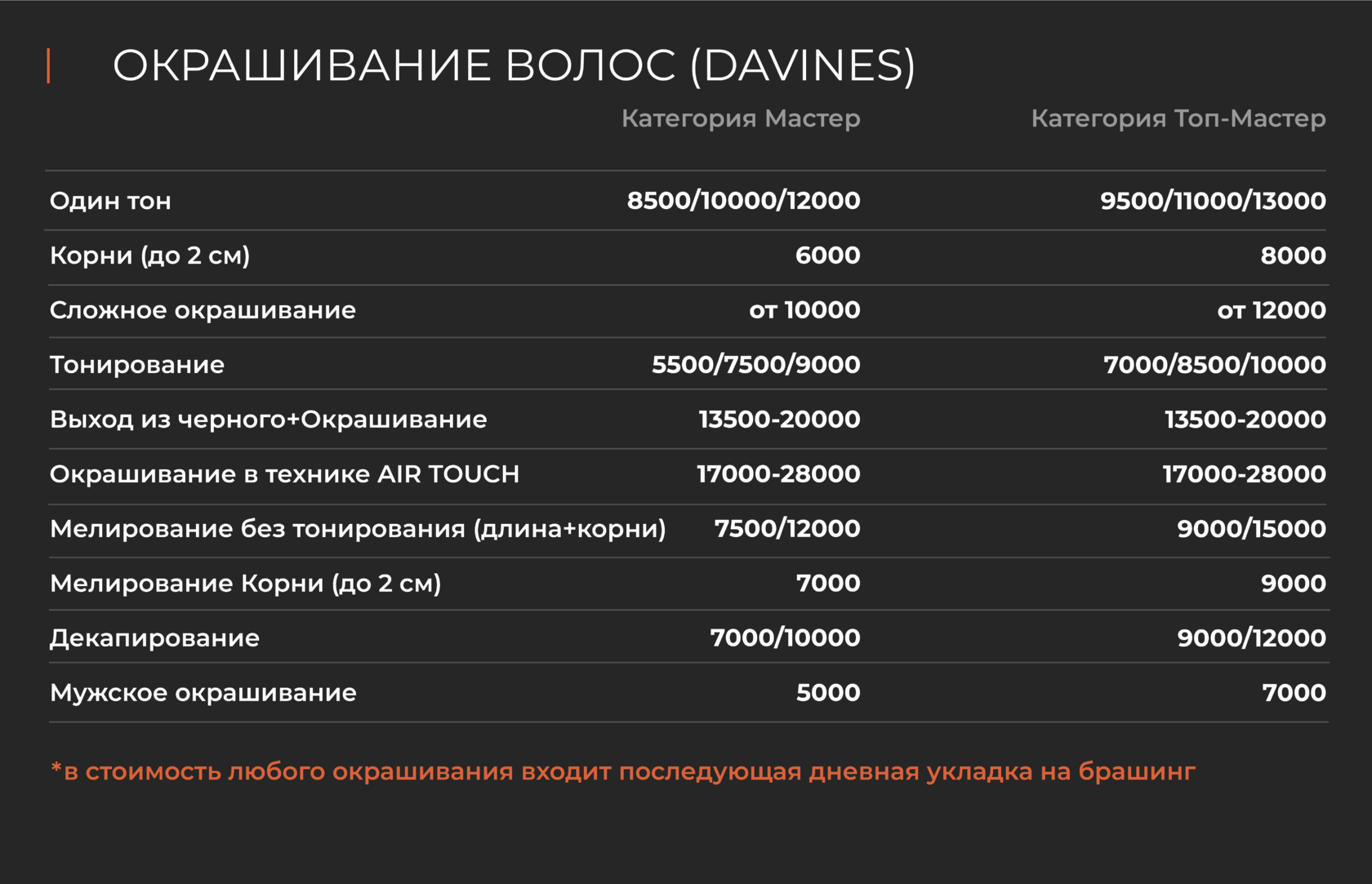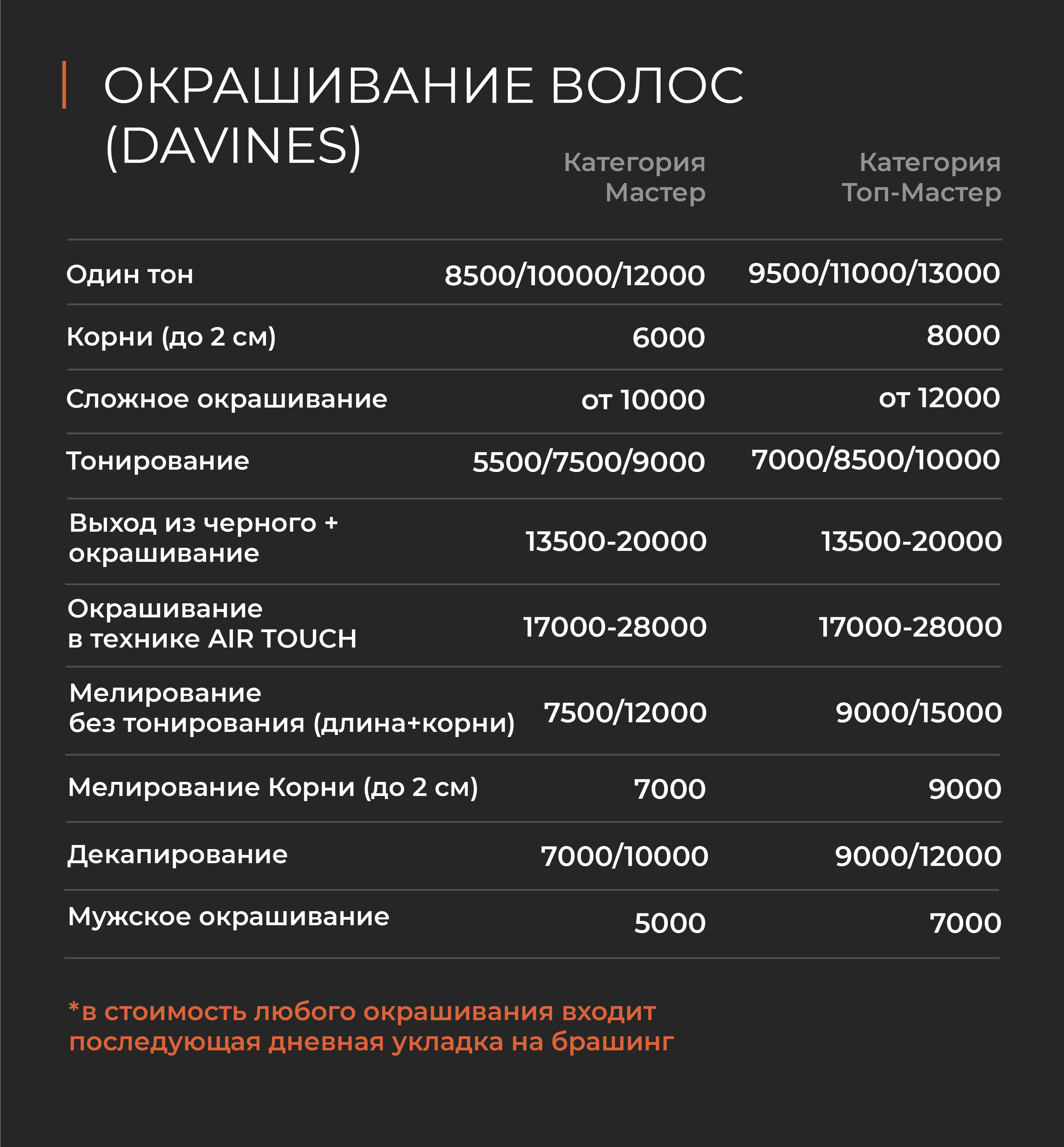 В сложное окрашивание входит осветление волос и тонирование в различных техниках, таких, как: балаяж, шатуш, мелирование и другие сложные техники. Точная стоимость зависит от уровня сложности, густоты и длины волос. Бренды красителей Davines, Wella (осветление)